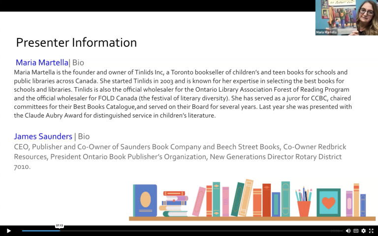 The latest School Libraries Connect session welcomed two superstar booksellers whose dedication to literacy and the Canadian publishing industry shines bright. Maria Martella from Tinlids and James Saunders from the Saunders Book Company highlighted an exceptional array of books available to educators and families. The breadth and depth of their book knowledge is impressive.